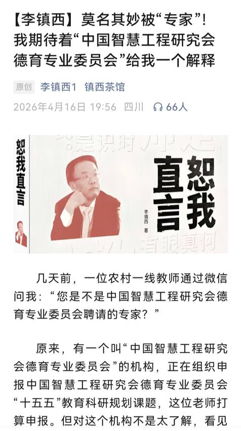 4月16日,著名教育家、全国优秀语文教师李镇西发文称,中国智慧工程研究会德育专业委员会在组织申报“十五五”教育科研规划课题时,在“专家智库”的名单上有“李镇西”,但并未取得他本人同意。4月18日,德育专业委员会相关负责人向封面新闻记者表示,系沟通过程中产生了误会,已取得了李镇西本人谅解。